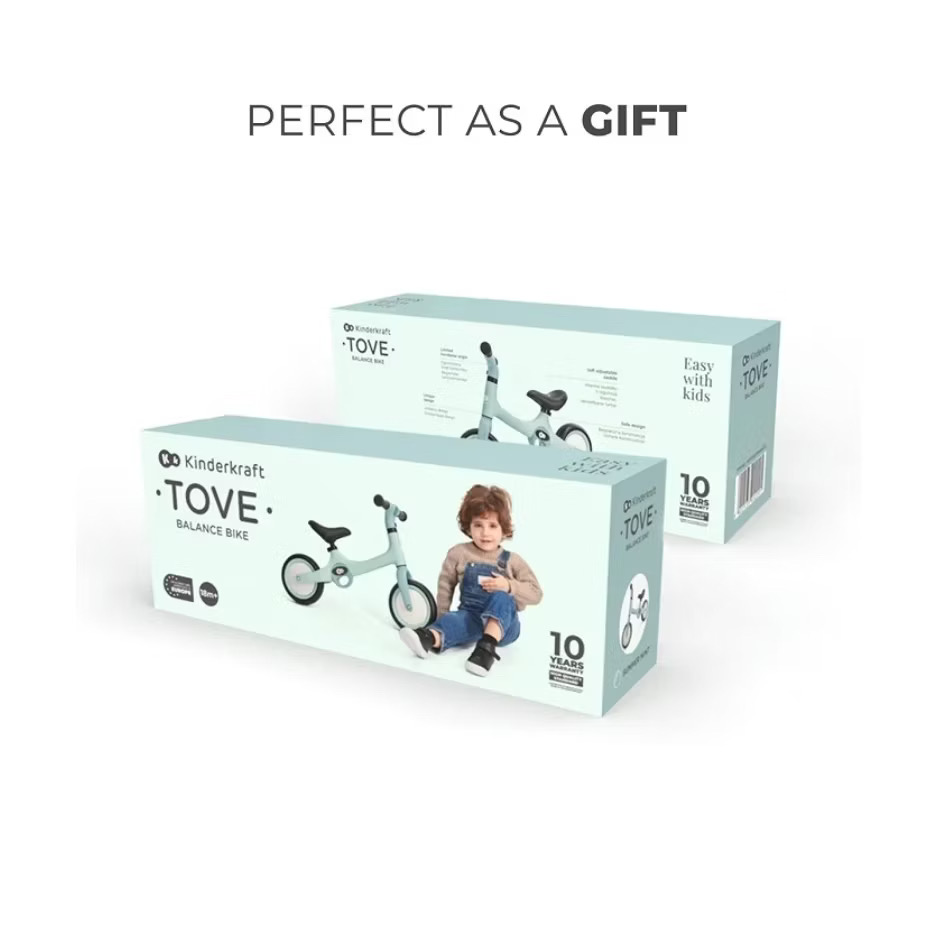 Main advantages - From 18 months of age - 2 practical carry handles - Durable and lightweight - only 2 kg - Puncture-resistant lightweight foam wheels - Designed for children 2 carry handles Your toddler got tired on a walk and doesn't want to ride anymore? We know it - that's why the TOVE balance bike has as many as 2 comfortable carry handles. Folding in 3 steps TOVE can be folded in 3 simple steps. Your child can ride a moment after taking the bike out of the box. Seat adjustment Toddlers grow quickly - to make TOVE serve your child as long as possible, you can adjust the seat in the range of 30-35 cm Puncture-resistant wheels The TOVE balance bike has lightweight pump-free foam wheels.